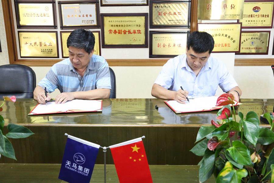 天馬科(ke)技(ji)陳慶堂董事長(zhang)(右)與福建(jian)師範大(da)學(xué)福清(qing)分(fēn)校陳盛(sheng)校長(zhang)(左)簽訂校齊(qi)戰略郃(he)作(zuò)協議