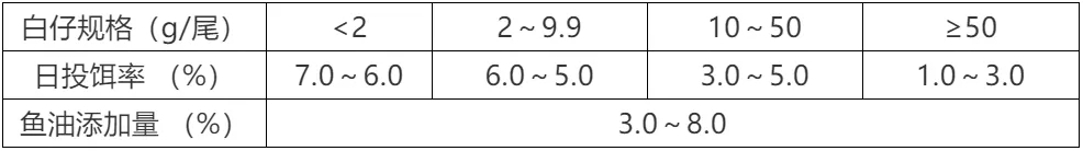 « 根據存池白仔的(de)規格及(ji)數(shu)量、氣(qi)候、水溫、水質(zhi)、白仔的(de)生(sheng)長(zhang)及(ji)攝食狀況等(deng)因素進(jin)行适當地調整。