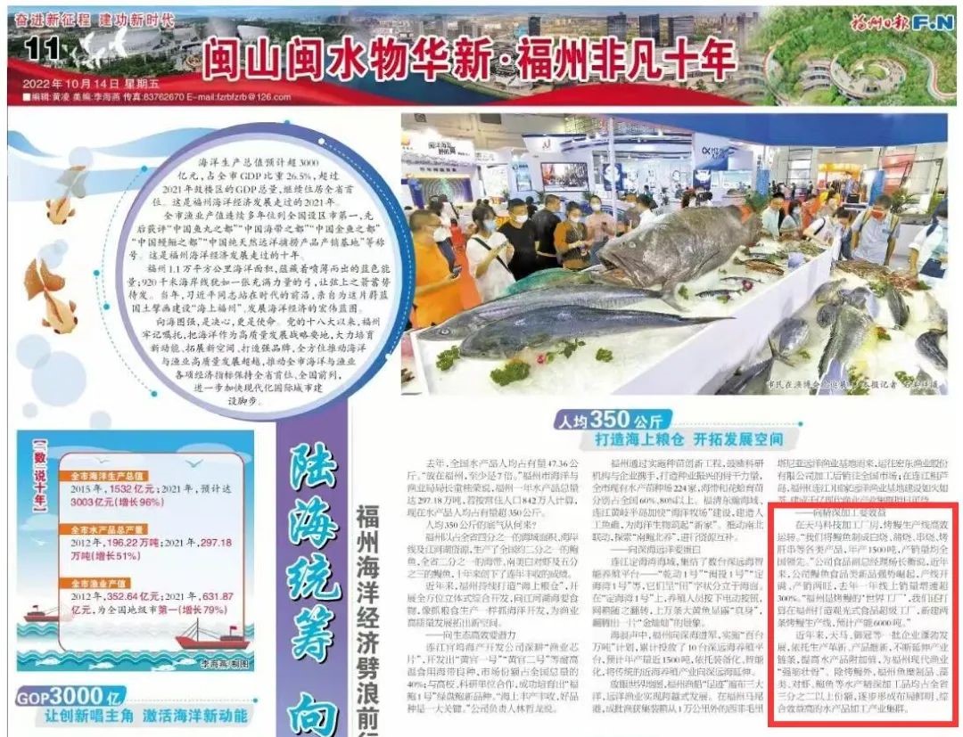 天馬科(ke)技(ji)訊 10月14日(ri),福州日(ri)報刊登專(zhuan)版報道《閩山(shān)閩水物(wù)華新(xin) 福州非(fei)凡十年(nian)》,報道了(le)天馬科(ke)技(ji)集(ji)團(tuán)布跼(ju)鳗魚食品(pin)全産(chan)業鏈,以(yi)高(gao)品(pin)質(zhi)預製(zhi)菜向精(jīng)深加(jia)工(gong)要效益,引領(ling)國(guo)鳗崛起,引髮(fa)了(le)社(she))會的(de)廣(guang)泛關注。報道如下↓↓↓
